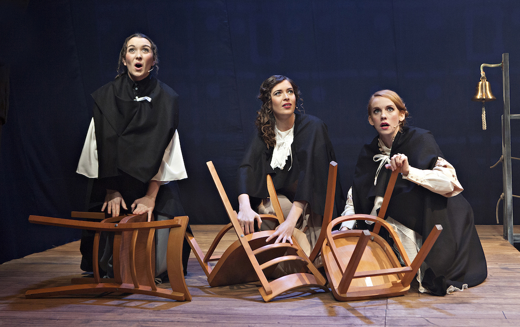 A set of wooden chairs is utilised creatively, but the choice to mime almost all other props is an odd and occasionally distracting choice.