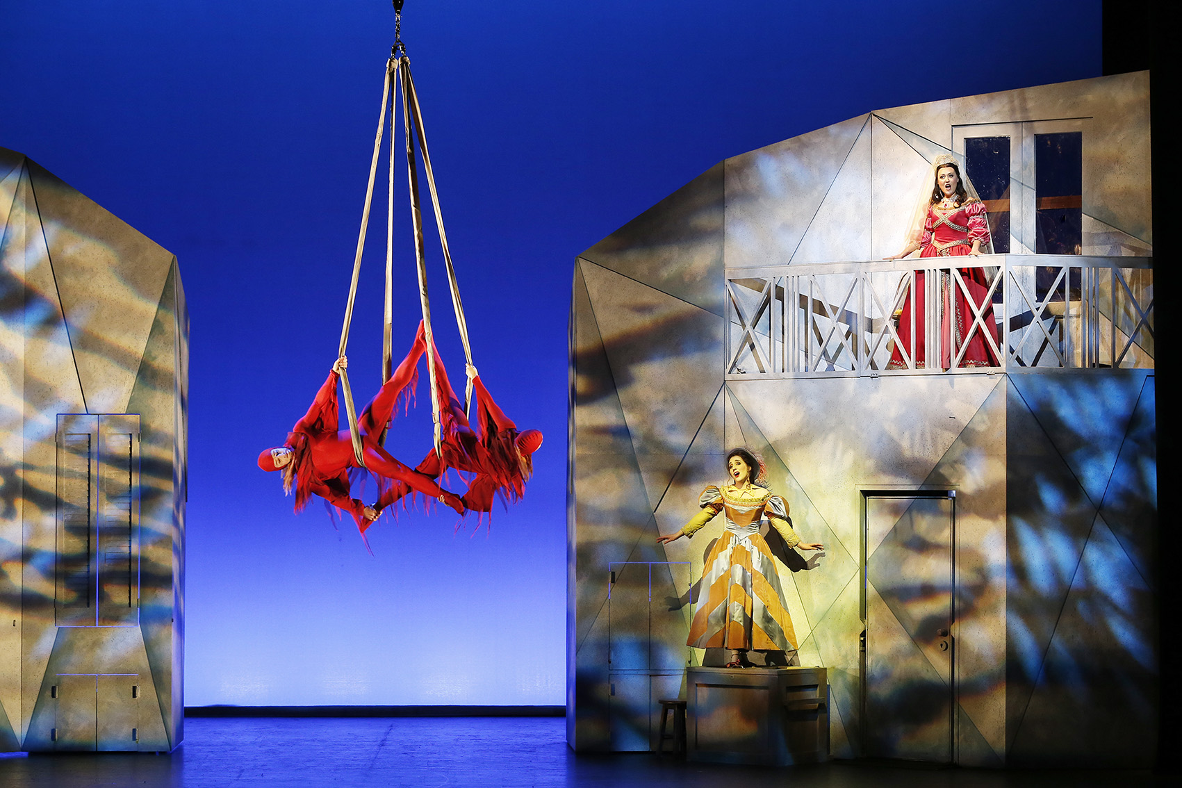 The madcap zannis are played by with highly physical flair by Kate Fryer, Geoff Dunstan, DJ Garner and Luke Taylor, with Tim Coldwell as doddering fool Capitano. As well as delivering plenty of visual slapstick humour, these performers from Circus Oz also perform gravity-defying stunts that are neatly tied in to the narrative action. When Dunstan swings high overhead as star soprano Elvira Fatykhova sings Nedda’s birdsong “Stridono lassù,” it is a thrilling highlight of the evening.