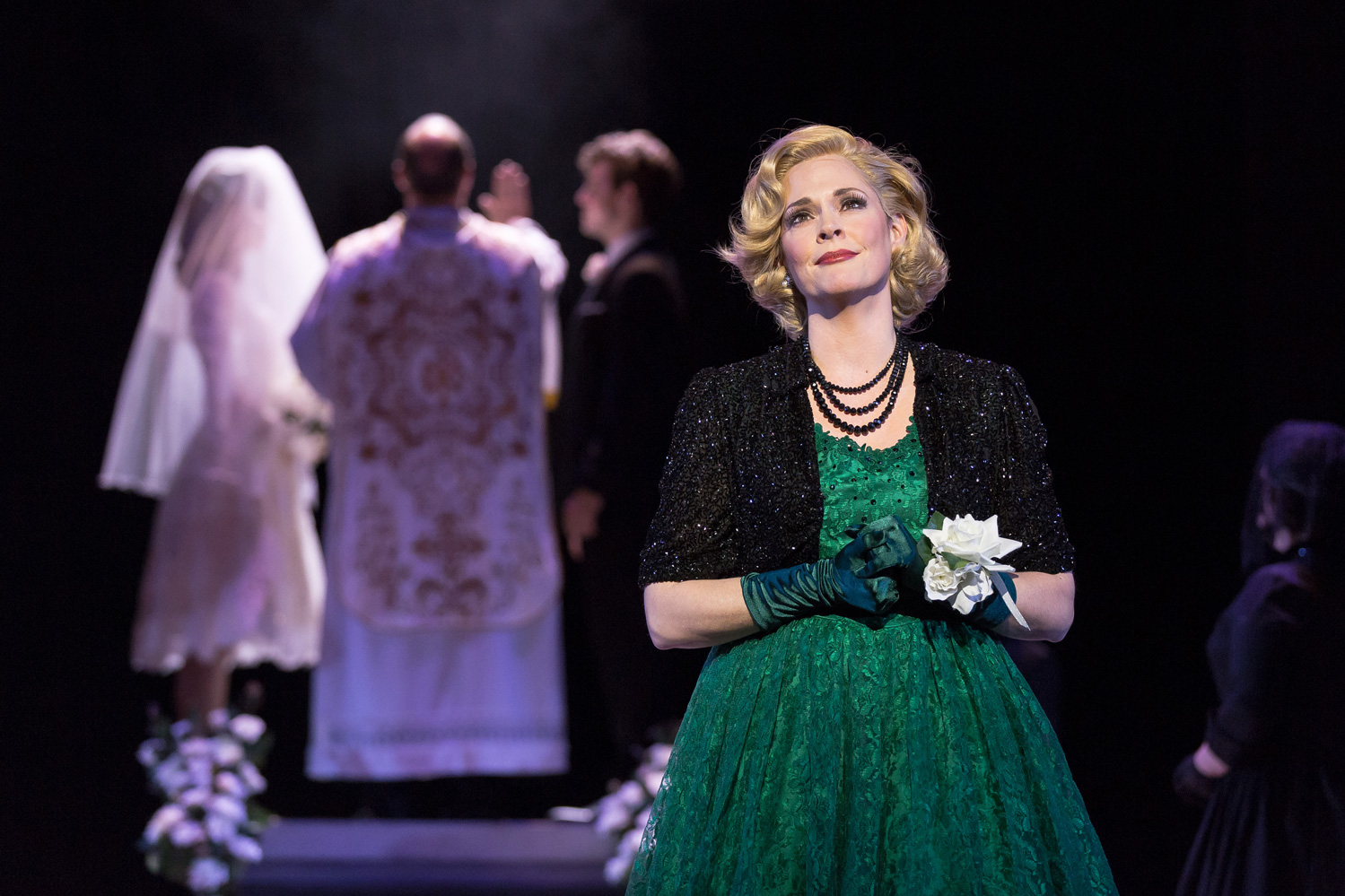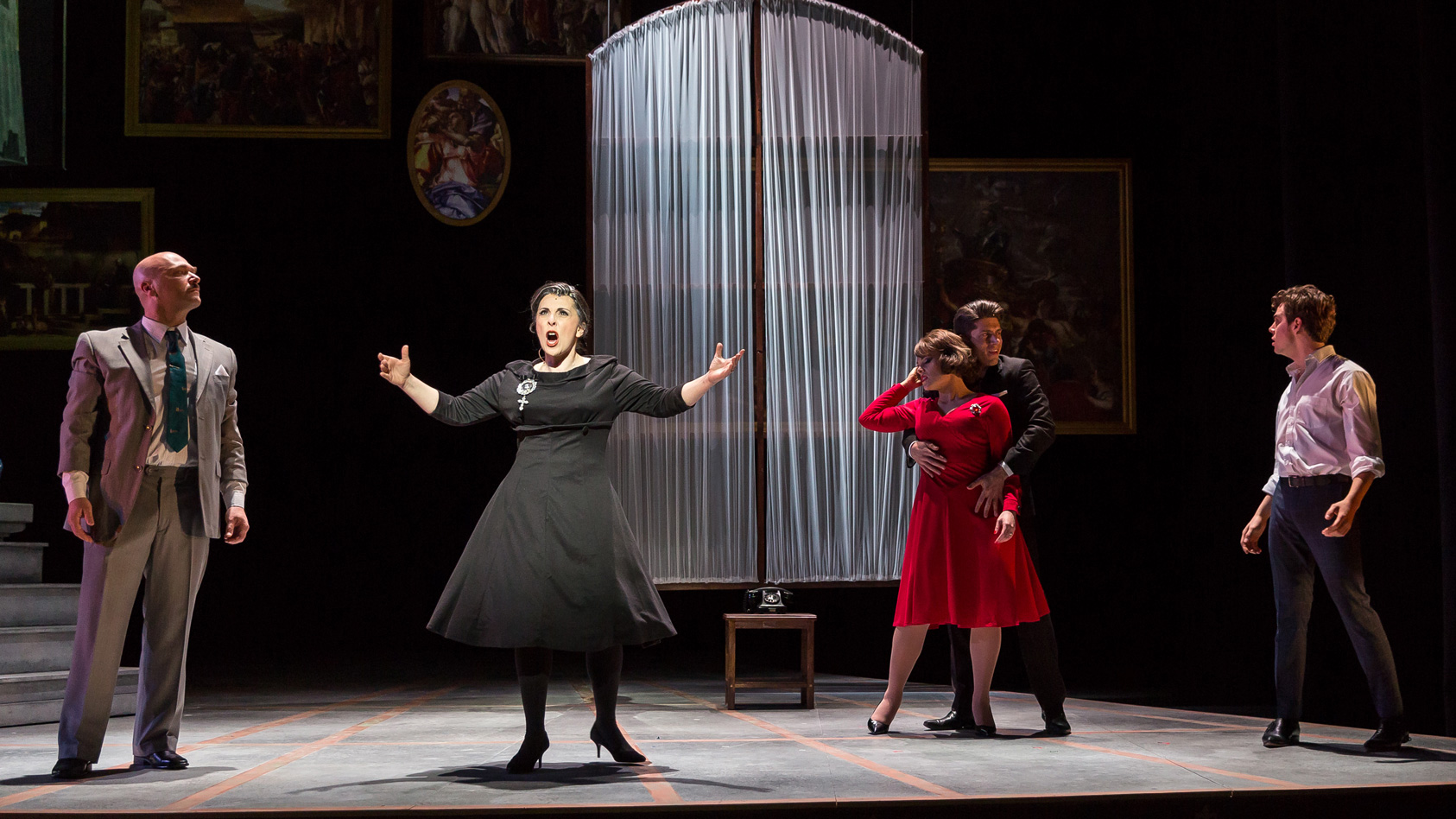 Complementing the grand stage design is the gorgeous 1950s fashion parade by Kim Bishop. Bishop has excelled himself, not just with the stunning designs but also with the pristine construction of so many truly beautiful costumes. Margaret and Clara must have quite the set of trunks, such is the extent of their glamorous wardrobe. Highlights include Margaret’s orange sherbet pleated chiffon dress and her final dark green brocade gown with shimmering black bolero jacket. Fabrizio’s mother is chicly attired in dramatic black, and his sister-in-law Franca maintains a curvy silhouette in siren red.
