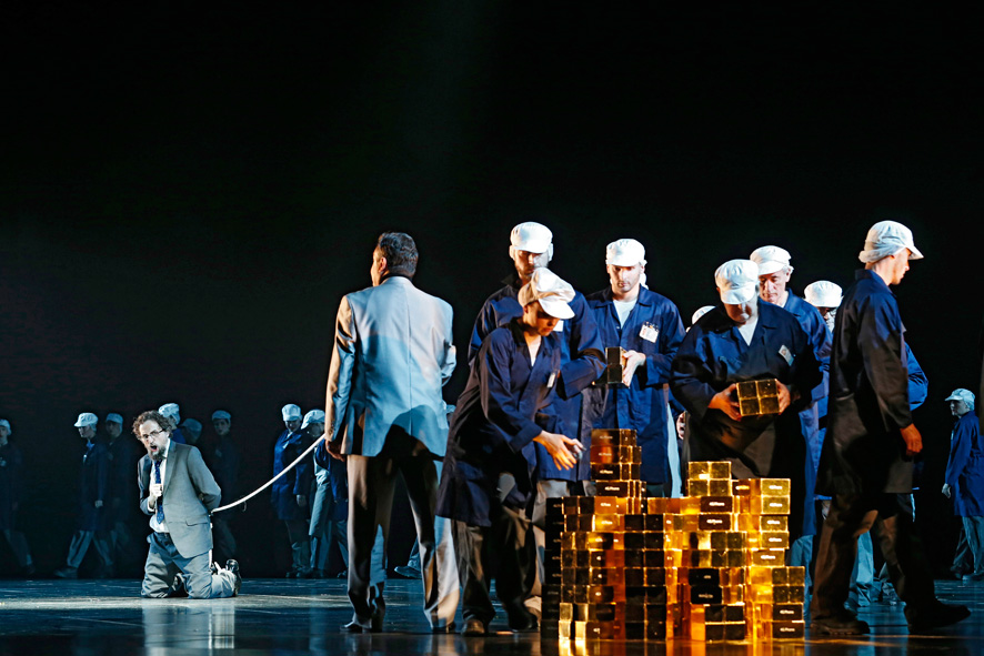 Alice Babidge’s costume designs add flashes of bright colour to the black landscape. Gods Wotan and Fricka appear to be straight from a 1980s night-time soap opera, Freia’s mini-dress is as golden as the bullion she is traded for, frolicking Rhine maidens sport stunning pale turquoise outfits and men’s suits befit their position in the line of power.