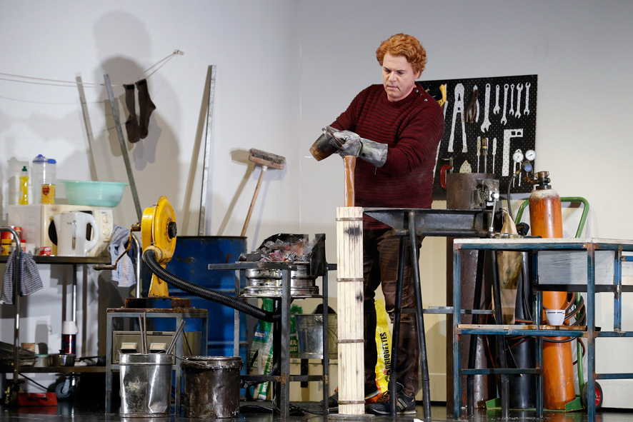 The poisonous dwarf Mime has raised Siegfried, son of Siegmund and Sieglinde, in a makeshift space with microwave, bar fridge and bunk beds. A stout, tousled haired youth, Siegfried’s dreams of fighting dragons and bears are seen in the crayon drawings on his wall. Having re-forged the sword Nothung, Siegfried aggressively cuts through the rear wall.