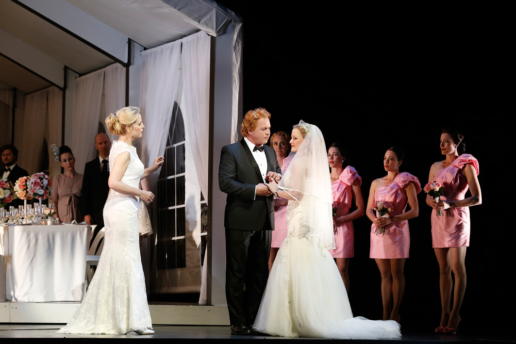 Costume designer Alice Babidge has fun with splashes of vivid colour for the Gibichungs, portrayed here as a rather gauche nouveau riche collection of military men and trophy wives. Oversized artworks share the living space with exercise machines and a bar. Siblings Gunther and Gutrune begin in matching white gym outfits before Gutrune changes into a garish neon orange frock and matching heels. She is clearly the sort of woman who would marry in a mermaid wedding dress with four breathless bridesmaids in candy pink minis.