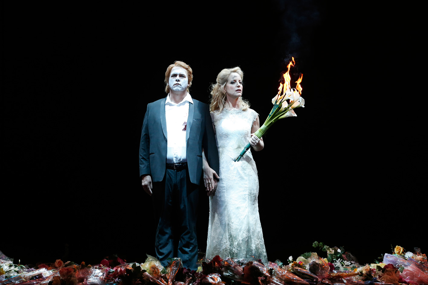 Set designer Robert Cousins again conceives of a scenic instalment that can be in place for the whole opera, flexibly portraying a range of locations. A large steel construct forms the frame of a building, first representing the cliff top outdoor bedroom Siegfried shares with Brünnhilde, then the interior of the Hall of the Gibichungs. For act two’s double wedding reception, a white canvas with arched plastic windows turns the structure into a capacious backyard marquee. Finally, the space is a hunter’s shooting range, before ultimately, and spectacularly, catching alight as Siegfried’s funeral pyre spreads flickering flames to the Hall of the Gibichungs.
