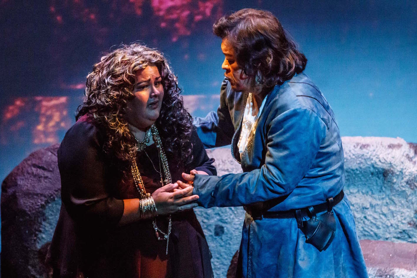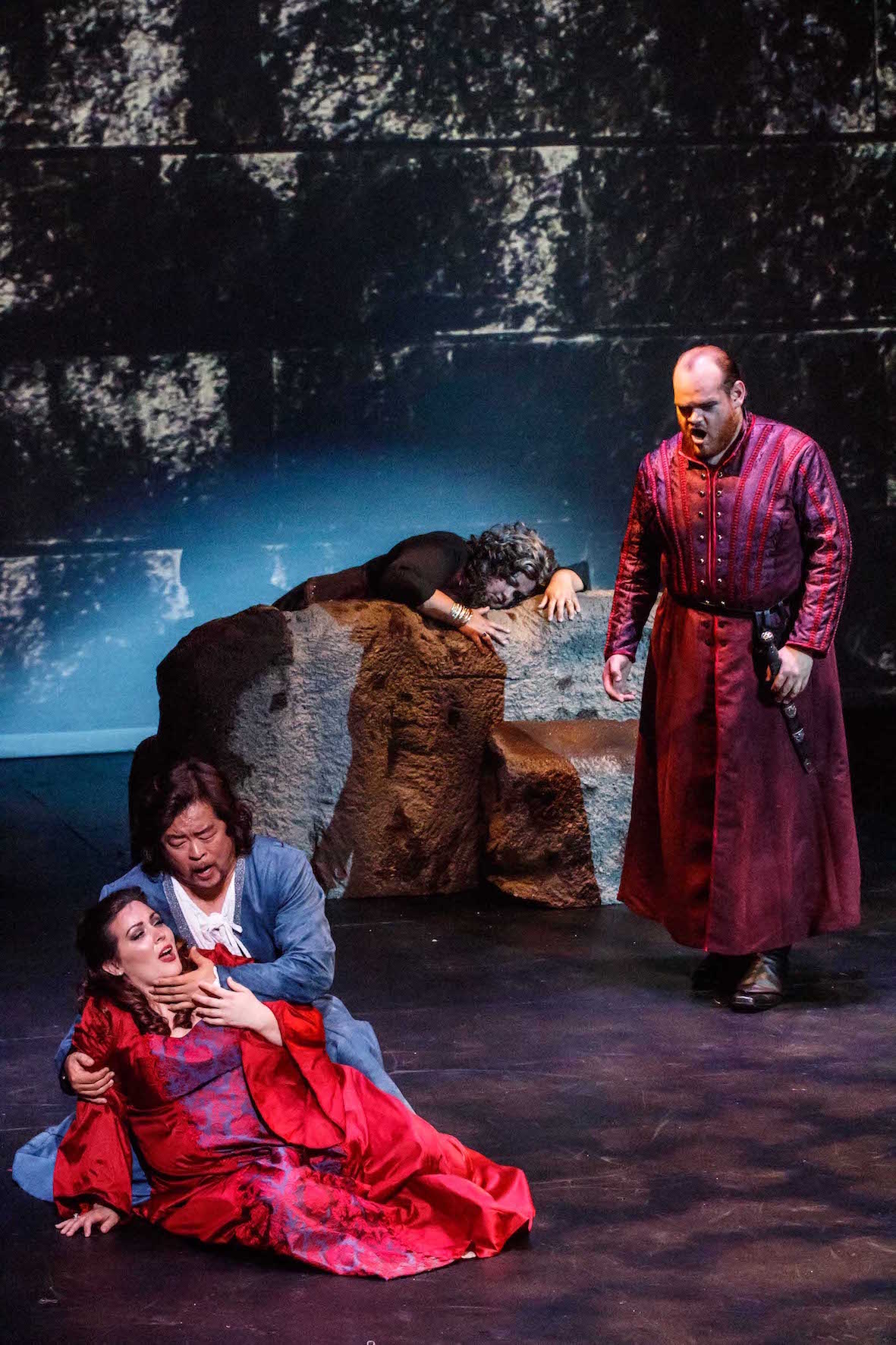 While the exact setting and era are not entirely evident, this is a respectfully traditional production. Sung in Italian, the big, clear surtitles make the action very easy to follow. Set designer Erika Kimpton-Etter leaves room for the ample chorus with a simple staging of barren trees and a large multipurpose rock. Numerous locations are conveyed by Des Nikas’ generally well-chosen backdrops, which are projected crisply onto the screen that fills the entire back wall of the stage.