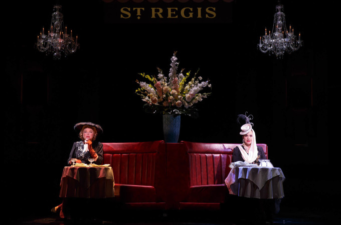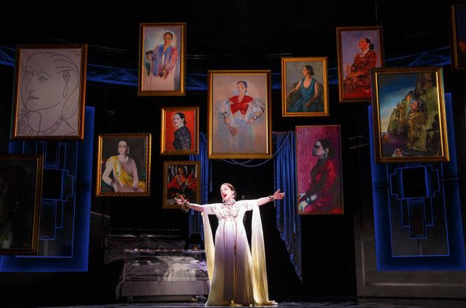 David Korin’s scenic designs have the luxurious edge that befits the glamorous world of the beauty business. A clever touch is walls of frosted glass bottles that can be lit in a range of colours to distinguish the setting of each woman’s beauty salon. In a striking scene, the elderly Rubinstein reflects on the artists who have captured her likeness as a wall of portraits hang overhead.