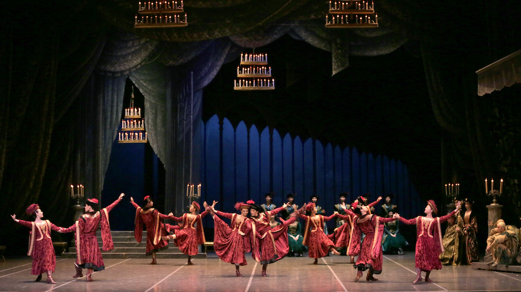 Largely consisting of painted backdrops, the scenic design has greatest impact at the top of acts two and four, when the curtain rises on the heavily misted lakeside setting. Swan costumes feature a dainty white headpiece and featherlight tutus that seem to float in space. Farmer creates a richly regal impact for Prince Siegfried’s Birthday in act three with the ensemble in elaborate brocade tunics, half in ruby red and the other half in emerald green. Siegfried and Odile’s gleaming black costumes in this scene are also supremely eye-catching.