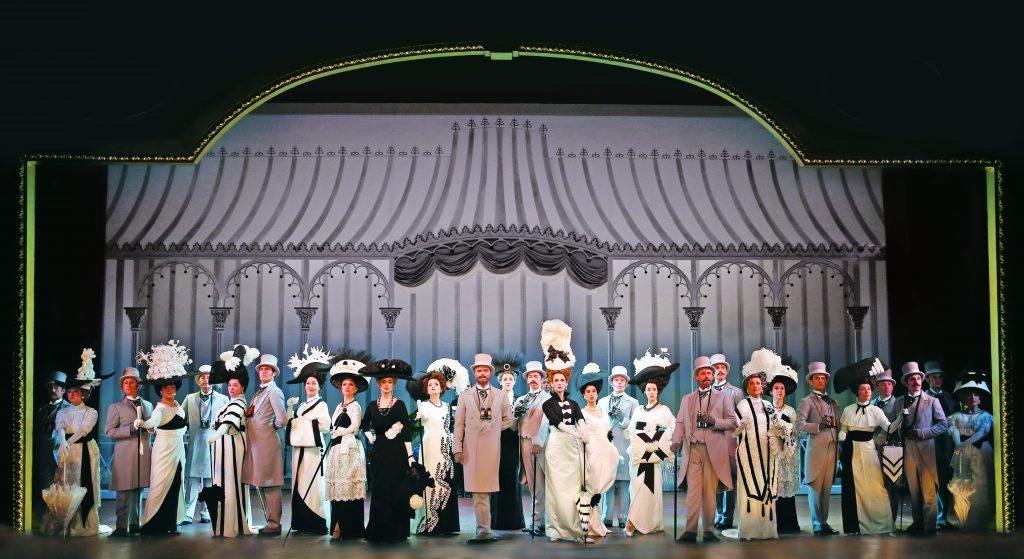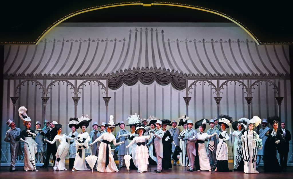 Cecil Beaton’s divine costumes have been recreated to sumptuous effect. Female chorus members are well served, being draped in jewel tones as they leave the opera in the opening, wearing pale pastel gowns for the Embassy Ball and sporting those eye-popping black and white creations at Ascot.