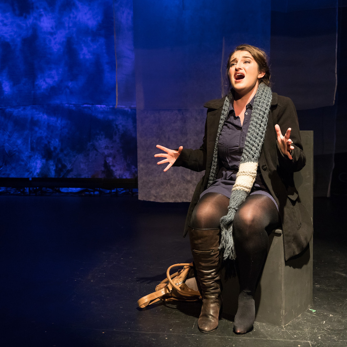Designer Sarah Tulloch makes clever use of floating gauze panels, which represent both skyscrapers and hanging works of art. Pale blue hues in the costume design tie in beautifully with the steely abstract background. Lighting designer Jason Crick ties the look together with temperate tones that reflect the mood of each scene.