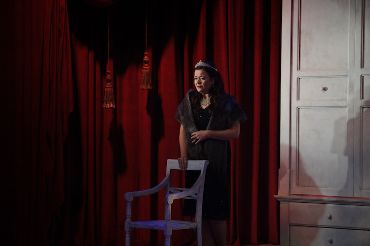 Design is attributed to Robert Sowinski, Dann Barber and Bryn Cullen, who each have areas of expertise yet presumably have worked together closely on this project. A white wooden square playing space stands orthogonally in front of rich red velvet curtains. A grand white armoire houses costume elements in its drawers and a dreamy bedroom behind concertina doors. The unobtrusive lighting design makes subtle use of colour to complement the emotional tone of the scenes. Costuming is an eclectic mix of styles, which make sense in their overall combination and work well for the conceptualisation of each character.