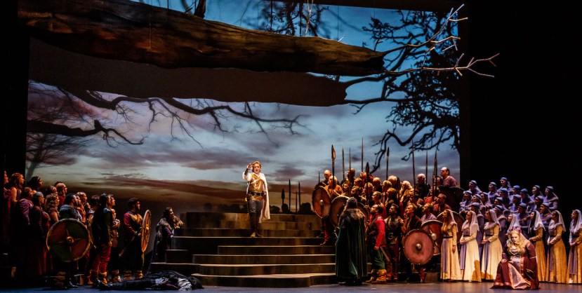 Logan-Bell’s scenic elements are enhanced by video designs, by Yandell Walton, which are animated by Tobias Edwards. The judiciously sparing use of these elements support the design without overwhelming it. Lucy Birkinshaw’s subtle lighting is sympathetic to the use of rear video images, allowing for vivid projection. A further technical element is added, to great effect, when Lohengrin appears and departs: a vapour screen (by Arthur Ipsaros) covers Lohengrin’s movements and displays his magical swan-drawn boat.