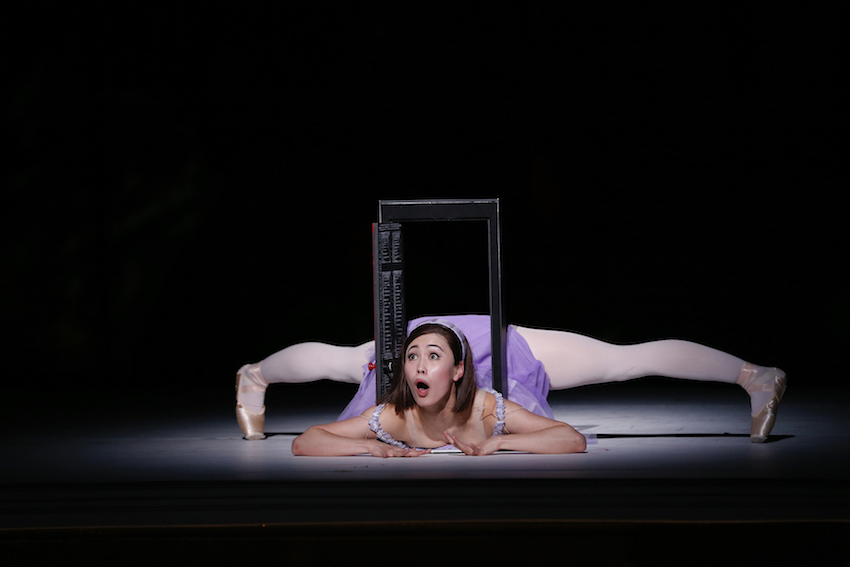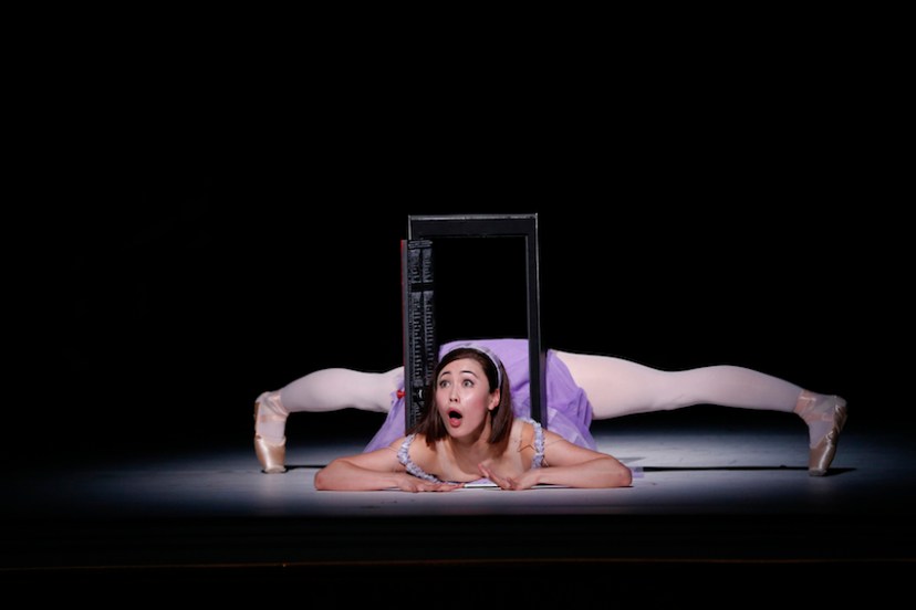 When Alice tumbles down the rabbit hole, she is briefly portrayed by a doll-like puppet. This turns out to be a very good match, as “doll-like” is a perfectly apt description for Principal Artist Ako Kondo’s performance in the massive title role. Off stage for barely a few minutes, the dancer playing Alice must extend her usual range of dance to include puppetry and interaction with multimedia. Kondo makes the entire affair look a breeze, successfully replacing her usual crisp precision with a highly endearing sense of playfulness and spontaneity.