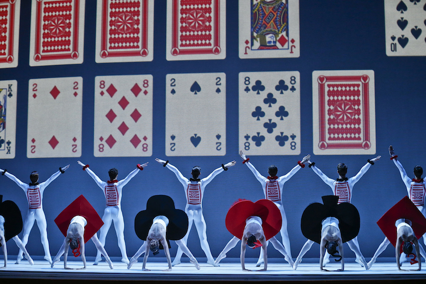Act two’s waltz of the flowers is a gorgeous homage to traditional story ballets, at once a tribute and also a nimble update. Crowley’s fluffy floral costumes enhance the dance with their air filled lightness and gorgeous spring colours. A later piece salutes the jerky precision of modern dance, with the corps de ballet portraying a deck of cards. Again, Crowley deals a winning hand, with the suits adorning the girls’ tutus only visible when they bend over forwards.