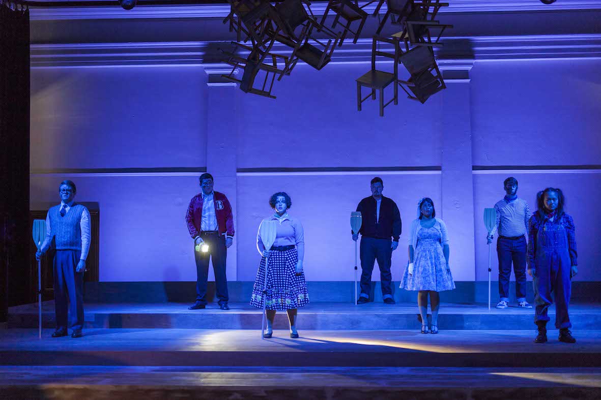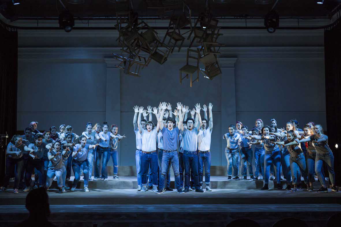 Rather than break the chorus up, Clark has them adopt different body language when playing parents rather than students. The parents are hunched and cross, contrasting with the effusive optimism of the students. Ultimately, this optimism is the message we want, and need, to hear.