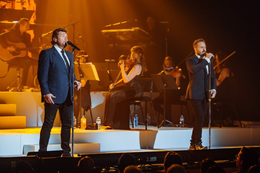 Such is the quality of the duo’s voices, a pot plant and a grand piano could well have been sufficient staging. In a bonanza for fans, the tour is actually produced on a lavish scale, with a 15-piece orchestra, three female back-up singers, tiered set, full height rear vertical LCD screens and spectacular lighting.