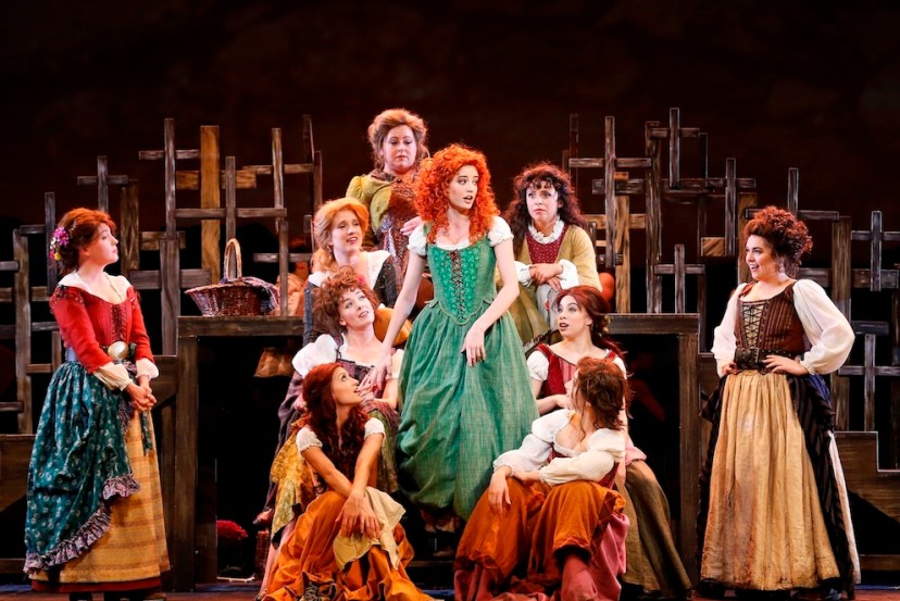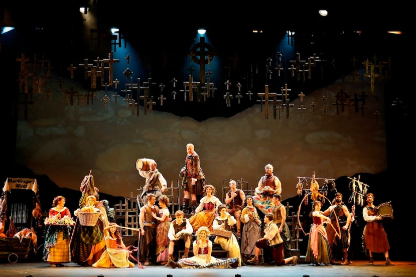 While the staging corresponds to previous presentations, with minimal scenery and the orchestra on stage, Langley has worked with his creative team to present a fresh and interesting appearance. Positioned well upstage, the orchestra disappears into the silhouetted hillside when not playing. Projections on a downstage scrim curtain add to the magic as the town of Brigadoon appears and disappears.