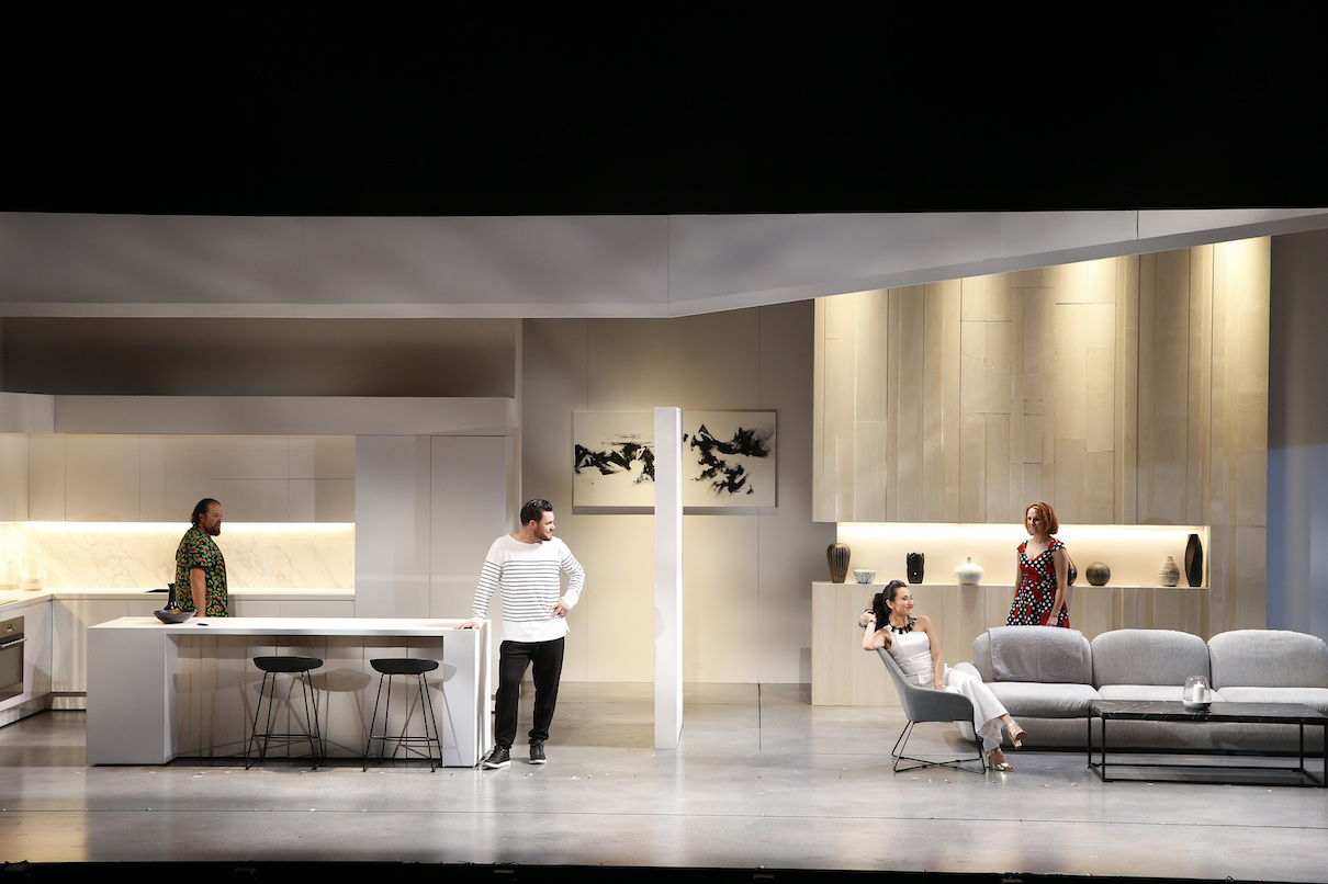A series of scenes tells the story in broad strokes, interspersed with witty, tuneful songs on topics such as rescue dogs, waiting for a plumber and soft close drawers. Design and storytelling are in perfect synchronisation, with the iris-like curtains opening and closing their aperture on intimate settings for the initial scenes, before opening to full width for the extended final scene.