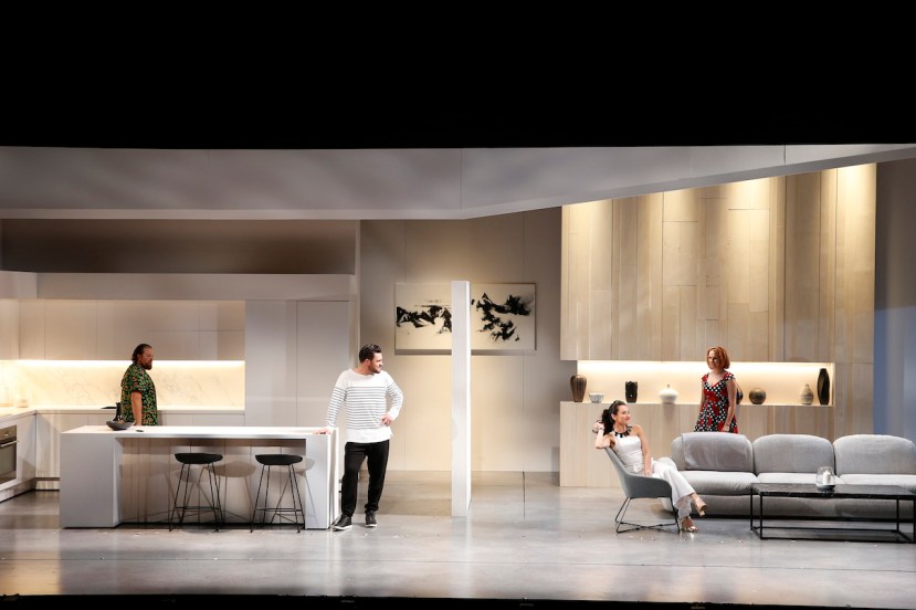 Owen Phillips efficiently spreads the set design budget over a multitude of scenes, surprising the audience each time the curtains reveal another new setting. The fully realised vivid white home is a real showpiece, with hidden surprises that will not be revealed here.