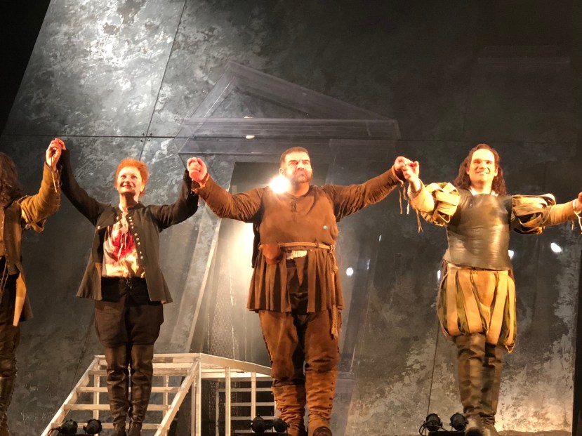 At the curtain’s rise, a ravaged woman is seen stumbling out of the castle half dressed; the connection between her trauma and the patriarchy is seen when she throws herself on the throne and screams.