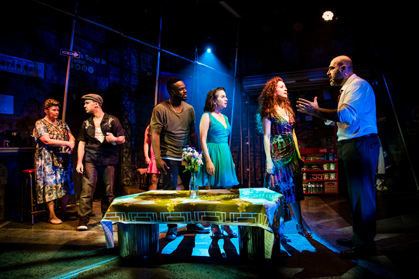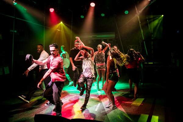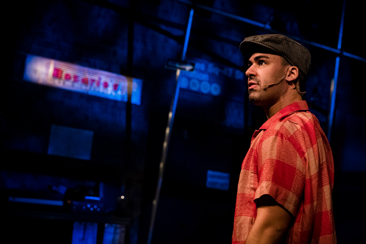 The high-power show has significant impact in the intimate Hayes auditorium. Sound designer Anthony Lorenz strikes a deft balance between vocals and instrumentals, and the detailed lyrics are heard with clarity. Simon Greer’s detailed set design makes excellent use of the space, housing just a representative element of each of the local businesses and creating a sense of depth with diagonal side scaffolding.