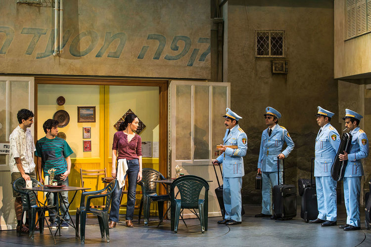 The score proves an excellent fit for the talents of Broadway composer David Yazbek, highlighting his strengths with fascinating rhythm and with intelligent lyrics. The songs derive organically from scenes, giving vent to characters’ inner voices through music. The Egyptian band members and Palestinian town members speak to each other in halting English, but, in line with the conceit already in place that breaking into song is natural, their English flows unchecked in song.