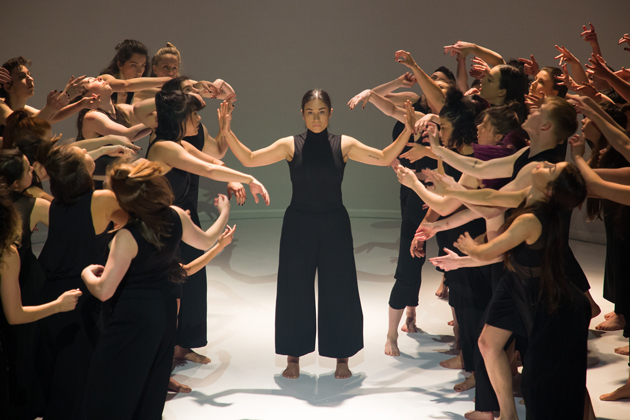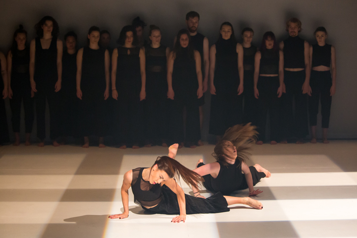 Entering the studio, the company of some 50 dancers is seen lying on stage in an impressively perfect circle. With feet pointing in and arms stretched over their heads, the dancers present themselves in an open, vulnerable position. The white, circular stage lies in front of a white sheer curved panel. There as many outfits as there are dancers, but uniformity is achieved with all black clothing, fitted on top and flowingly loose in pants.