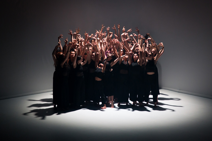 Arising from the circle, the dancers spend some moments in the dark, emitting a disconcerting hissing sound. When the lights come up, the dancers are neatly arranged in rows as if for a school photograph. A disembodied voice instructs the movements, which the dancers follow as if under a hypnotic spell. Lighting designer Bosco Shaw uses footlights to magnify these movements into fascinating overlapping shadows on the rear wall.