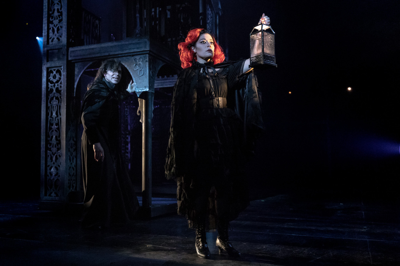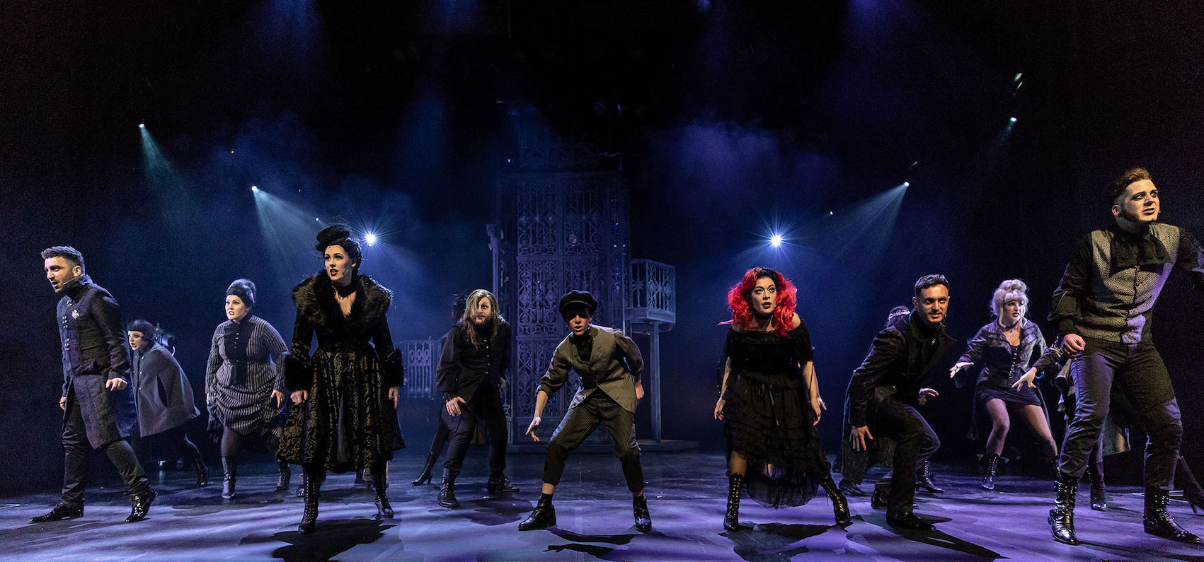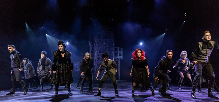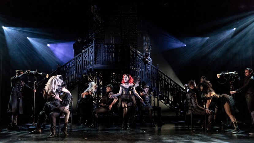 If there is one cost to Kingma’s swift and exciting direction, it is that the show’s central theme of duality is basically ironed out by having all of society look like they are off to Victoriana Halloween. Costume designer Victorian Horne outfits every member of the company in decadent, individual black costumes, set off by elaborate wigs from David Wisken. The look is grand, but the contrast between high society board members and streetwise Londoners in and around The Red Rat is completely lost. Even the contrast between leading ladies Lucy and Emma is basically erased, leaving the already underwritten Emma with even less of a character to play.