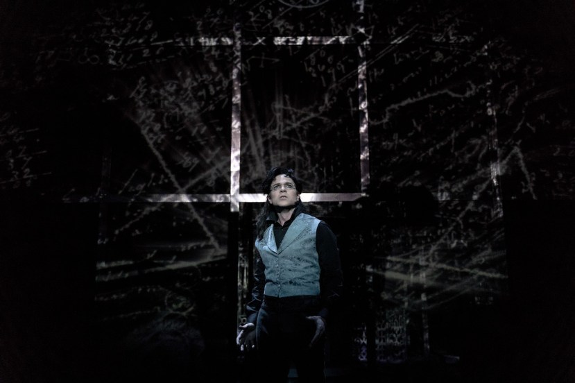 Kingma makes his mark on the show immediately apparent, with the opening moments featuring a soundscape of white noise as projected images of Victorian people precede a brief appearance of the lead characters. A structured scrim replaces the show curtain, with similarly elegant panels side stage signifying a modern production of a period show.