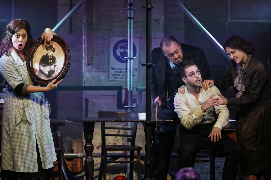 Simon Lobelson gives an extraordinary performance as Gregor, singing with steely, focused power and expending unbridled physical energy in the highly demanding role. Gregor spends much time in his room, where Matheson has Lobelson climb and crawl about the place, even singing while hanging upside down in one amazing sequence. With just a fluttered piece of costume for his back, Lobelson conveys the transformation through his physicalisation, also clearly demonstrating Gregor’s horror and impotence at the all-consuming change.