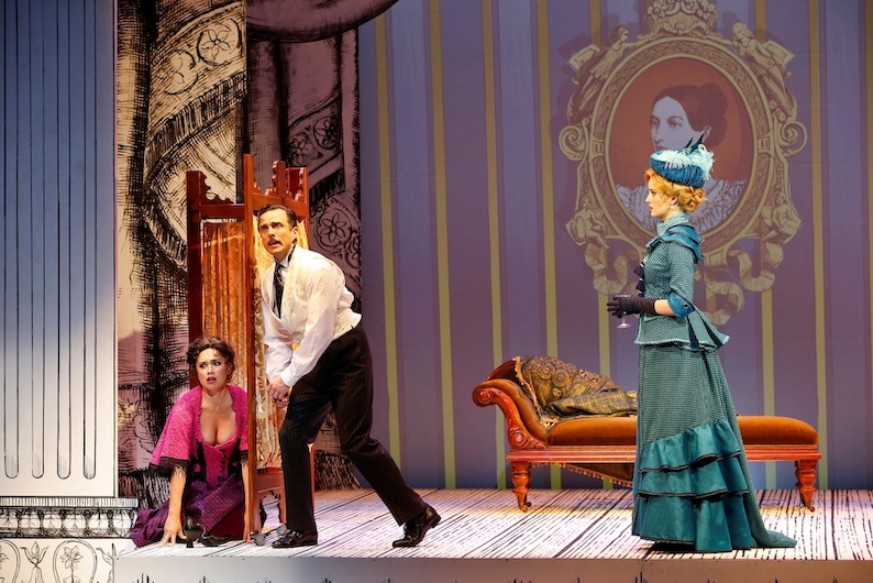Costume designer Isaac Lummis has outdone himself again, crafting gorgeous confections that significantly enhance the viewing pleasure. Dueling dames Sibella and Phoebe sport luscious gowns, with Lady Hyacinth’s lavender ensemble fit for the finest work of Oscar Wilde. Each outfit is set off beautifully by Trent Whitmore’s wonderful wigs. And there really is nothing like a Phillip Rhodes hat.