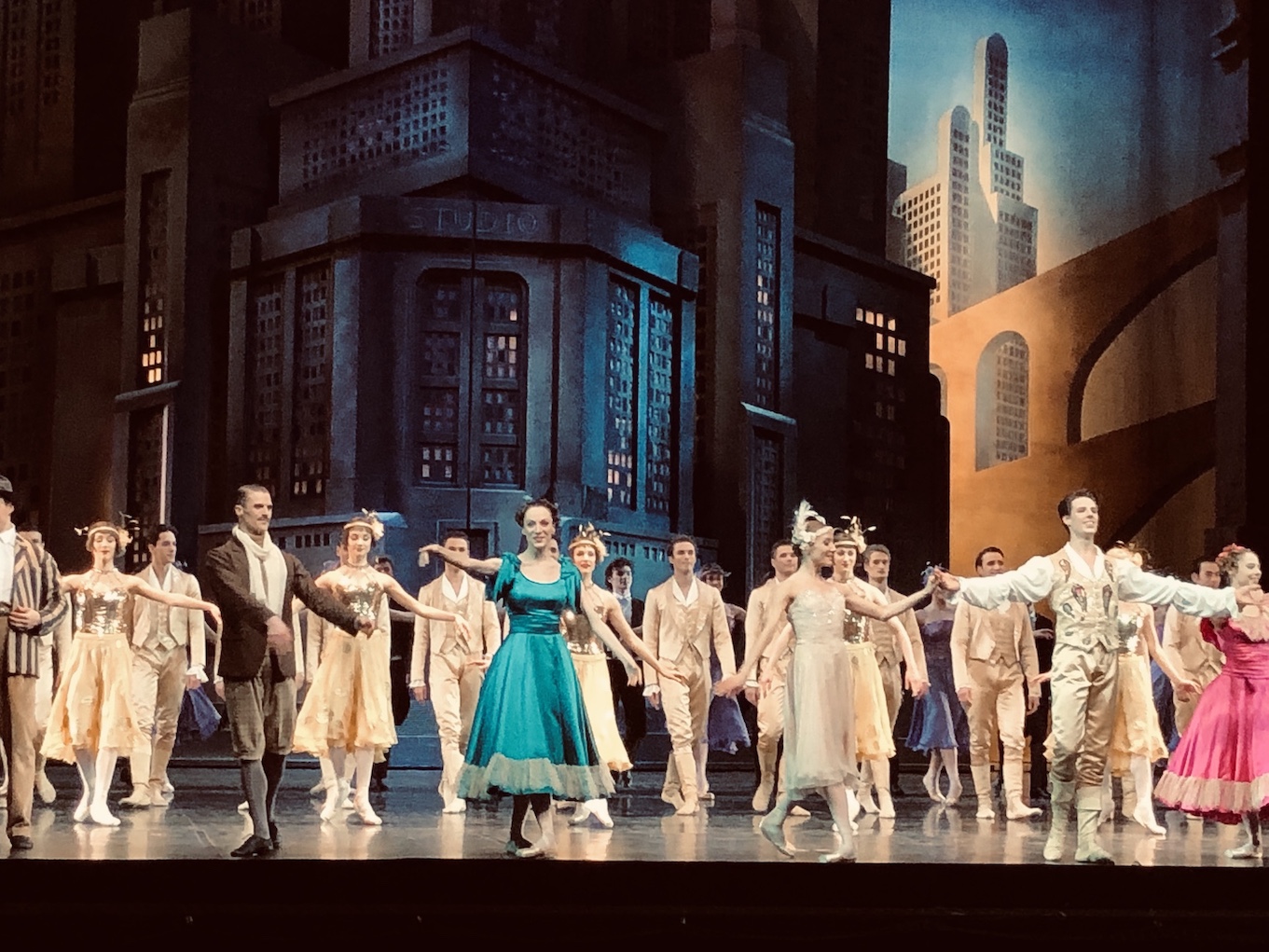 Halfway through act one, the family home flies out to reveal a mighty film studio. In front of the massive metropolis of the studio hang three giant cutouts of 1930s showgirls. IN the ballet’s most abstract sequence, each of the seasons perform a dance, with spring, summer, autumn, winter each represented by one lead girl supported by two male and two female dancers.