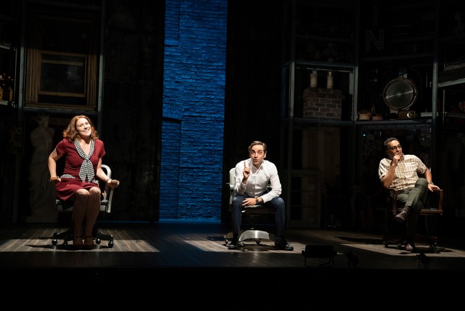 Performed by just six actors in a single act of 110 minutes, the piece flows with the energy and focus of a movie. In jettisoning the chorus, the most noticeable cut to the score is the removal of the seven “Transitions.” Set in a towering and highly detailed props room, everything the cast needs to perform the show is at their fingertips, with changes happening before our eyes rather than offstage during these transitions.