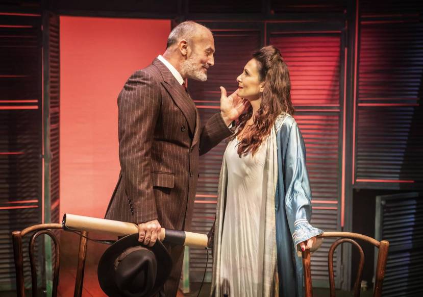 Designer Jason Denvir provides a rear wall of shuttered doors, behind which lighting designer Aaron J Dootson often provides glowing colour. The front row of the audience, which is on three sides of the stage, has little candlelit tables, which are often used by the cast, in addition to the furniture that is added to centre stage. Full credit to stage management for the smooth flow of the numerous costume/furniture/prop changes throughout the show.