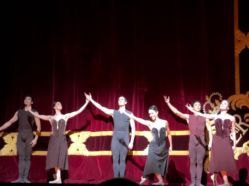 In black, Laura Morera and William Bracewell begin separately and then “find” each other as they dance the lively middle movement. Meaghan Grace Hingis and Luca Acri, wearing dark burgundy, dance the spirited final movement. The full company assembles on stage for a brief climactic finale. In the final split-second image, the dancers stand like rows of crucifixes in a cemetery.