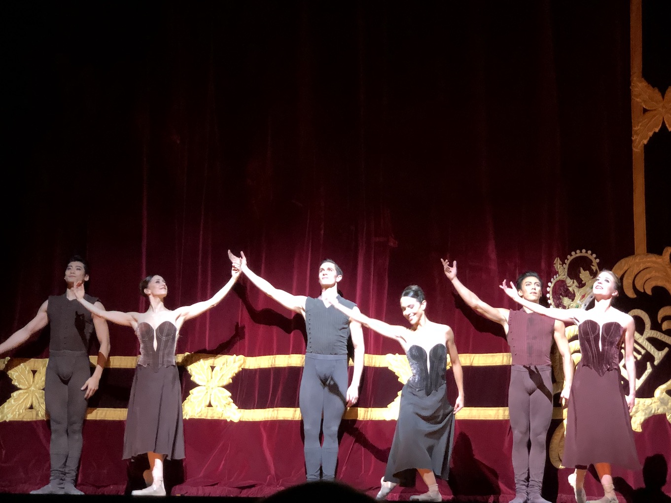 In black, Laura Morera and William Bracewell begin separately and then “find” each other as they dance the lively middle movement. Meaghan Grace Hingis and Luca Acri, wearing dark burgundy, dance the spirited final movement. The full company assembles on stage for a brief climactic finale. In the final split-second image, the dancers stand like rows of crucifixes in a cemetery.