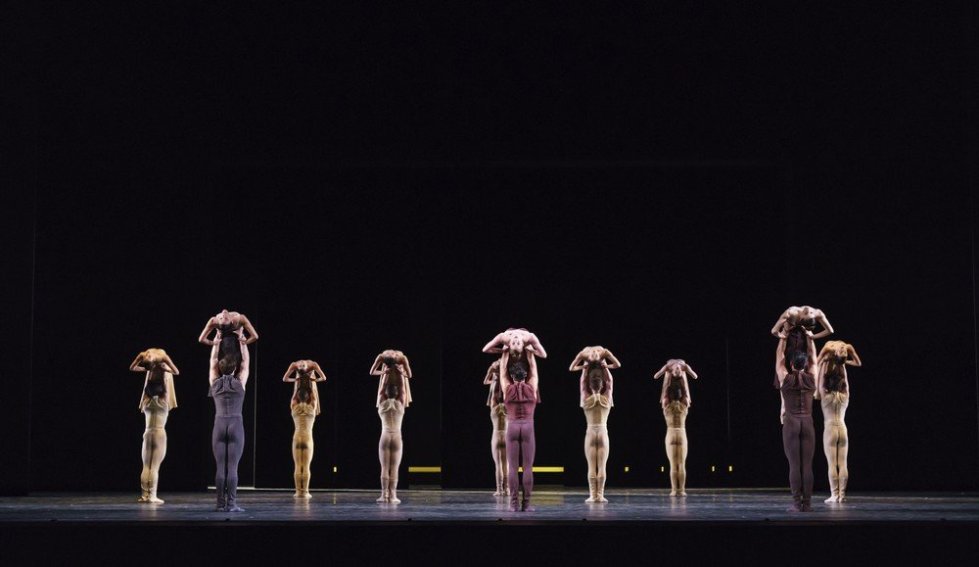 The piece begins with three female dancers walking backwards towards the audience from a floor-level light bar, the rear of the stage disappearing into inky blackness. Designer John MacFarlane frames the space in black, with rear vertical panels sliding into new positions occasionally to create stripes of light.