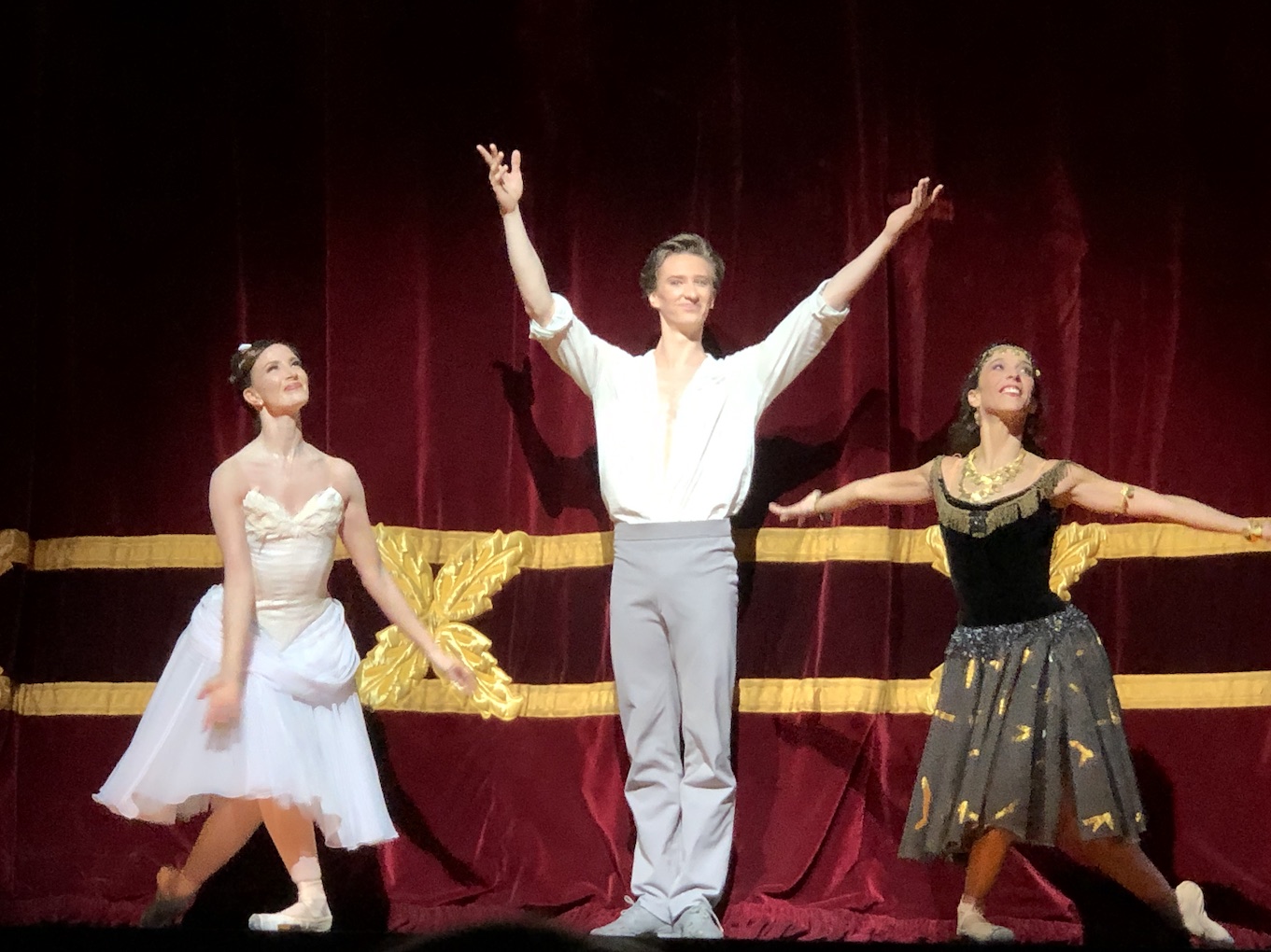 As the Young Man, Vadim Muntagirov must initially be something of a killjoy, annoyed with Cuthbertson’s Young Girl for making his efforts with painting difficult. Impetuously following the Gypsy Girl to her camp, the Man takes on a smile in act two, as he tries win the Gypsy’s affection. Muntagirov’s key solo, brief though it may be, is a marvel to behold.