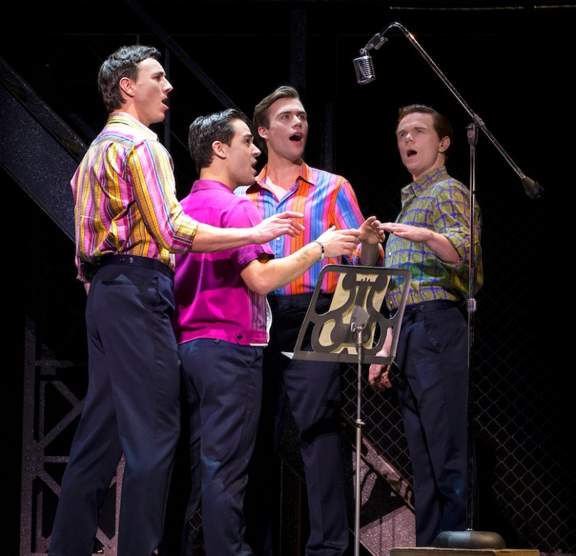 The second inspired decision in the book is to have each of the Boys narrate a quarter of the show, so Tommy DeVito, Gaudio, Nick Massi and Frankie Valli have a “season” each. Compared to the eye rolling conceit of The Cher Show where three actresses play Cher (and Summer, where three actresses play Donna Summer), Jersey Boys is golden.