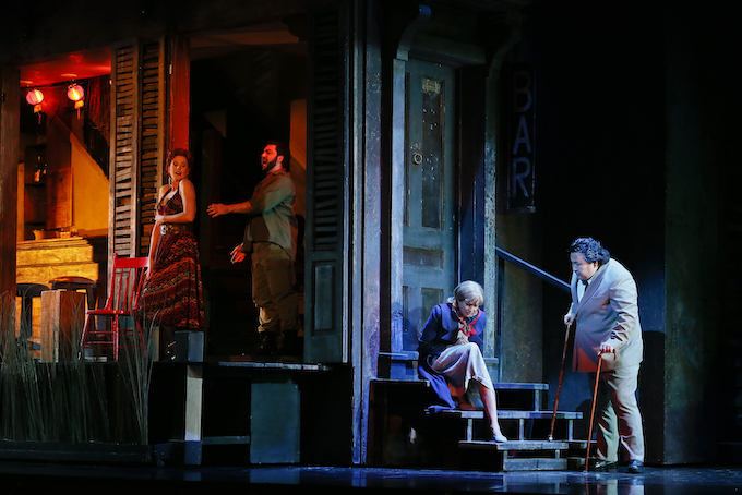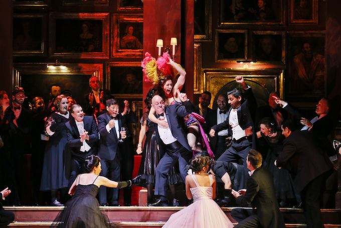 Director Elijah Moshinsky’s 1991 production shimmers with a darkly burnished, decadent La Dolce Vita aesthetic. Last seen in Melbourne in 2010, the production’s return indicates that the underwhelming 2014 Rigoletto has been shelved. The richly detailed revolving set may be small for the State Theatre stage, but revival director Hugh Halliday has made good use of the ample surrounding space to give the drama room to move.