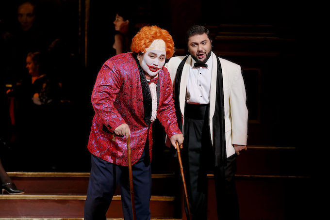 Enkhbat’s broad expressive face even conveys emotion from behind the white clown make-up, and he clutches Rigoletto’s walking sticks as though he had a walking difficulty of his own. In absolute command of his vocal performance, Enkhbat exhibits a gorgeous Verdian legato and maintains exquisite control over his dynamics. Vocal expression ranges from tender father to thundering madman, with these emotions also reflected in his facial expression and body language.