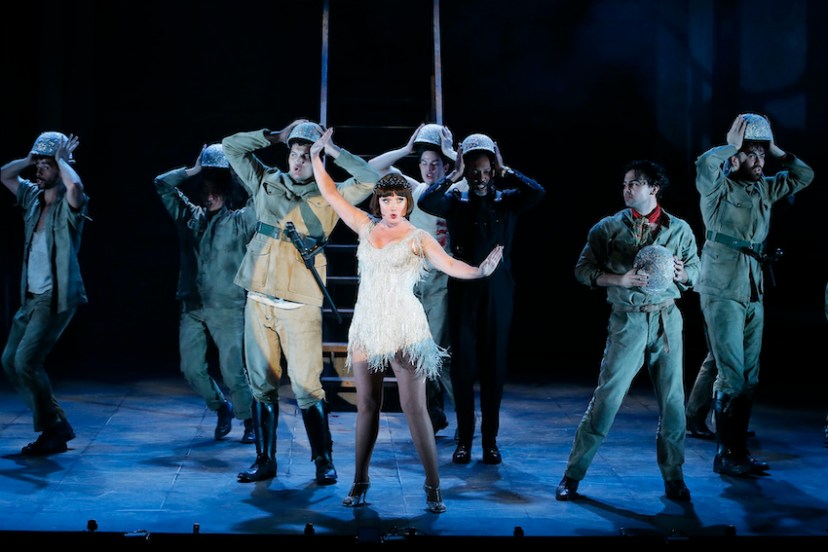 A Kander & Ebb specialist if there ever was one, Caroline O’Connor gives an iconic performance as the exotic Aurora, performing a dazzling range of styles to showcase Aurora’s screen career. A veteran of the world stage, O’Connor creates allure and appeal, even though the book provides nothing of Aurora as an actual person. In particularly strong voice, O’Connor brings a depth of expression to the songs, and sings unfailingly even when in a range of contortions and lifts. O’Connor’s gift for comedy comes to the fore as act two commences with “Russian Movie” / “Good Times.”