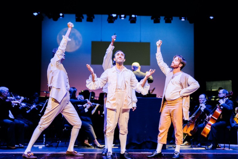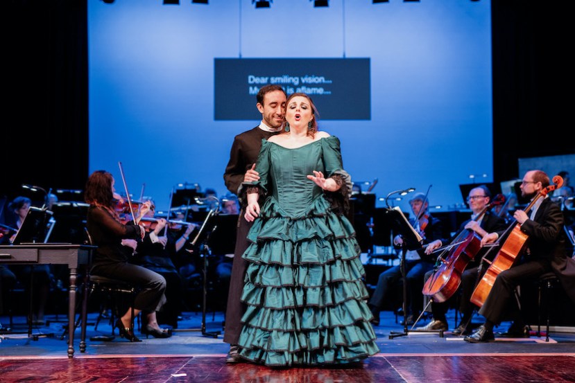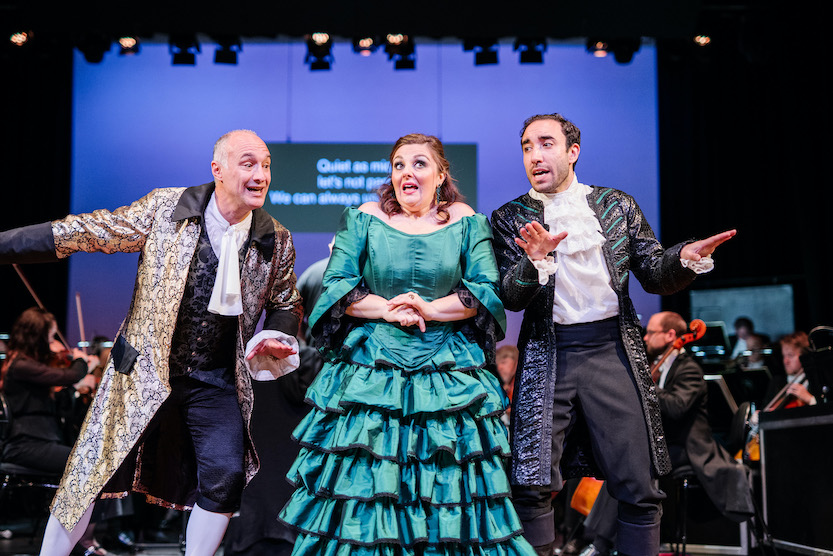 The “semi-staged” tag refers to the absence of sets, but the concert is handsomely costumed (by Kate Glenn-Smith) and fully acted. Doors and balconies are important in the storytelling, yet director Elizabeth Hill-Cooper delivers a perfectly clear narrative working with a few simple platforms (and a very talented cast). In a well-judged staging, Hill-Cooper ensures that even the wackier moments of humour are firmly based in the libretto itself. With a just relatively short rehearsal period (and an out of town season in Launceston), the cast members have developed a palpable sense of trust, taking joy from each other’s performances.