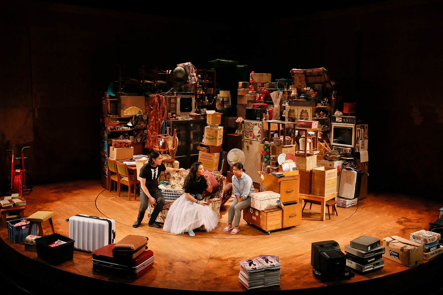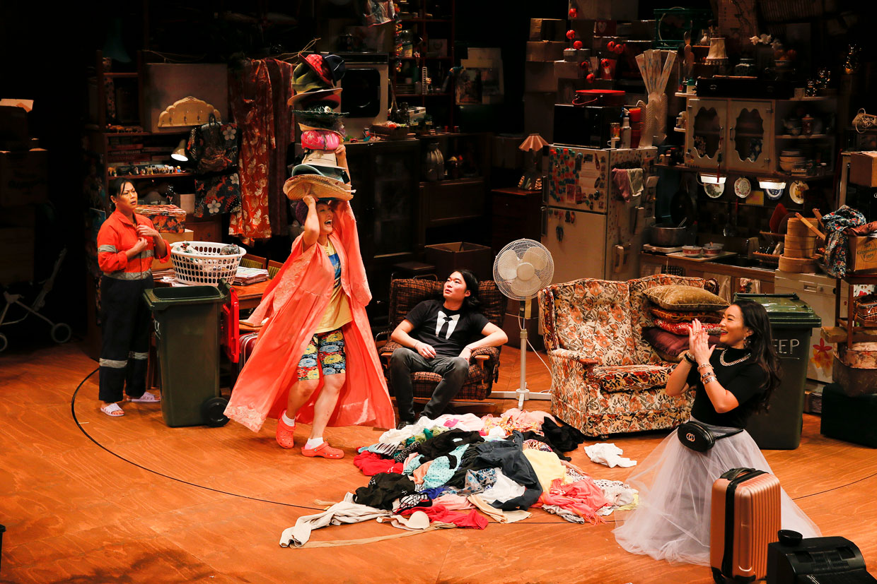 Bryant has clearly worked closely with his designers in crafting this world premiere as the physical production is as much a character as the five family members. Making a highly auspicious Melbourne Theatre Company debut, set designer Isabel Hudson works with confidence and vision to create the imposing piles of belongings. The set is cleverly designed to revolve to establish three zones. Initially looking like the MTC prop store has simply been emptied onto the stage, further inspection of myriad details reveals great thought in portraying the life and history of the family. Full credit to stage manager Julia Smith and her crew for the daunting task of reconfiguring the complex setting for each performance.