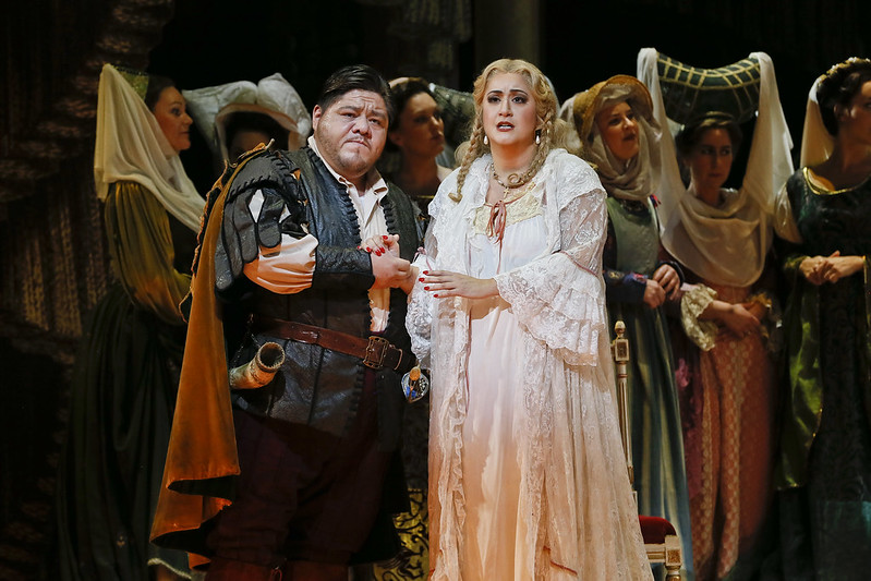 Doing double duty in repertory with Aida, Alexander Vinogradov is in superb form, practically stealing the entire opera with his magnificent first scene “Infelice!… e tu credevi… che mai vegg’io!” Vinogradov is fearless in conveying the black heart of Don de Silva, the thrill of his luxurious, unwavering bass voice leaving the audience wanting more.