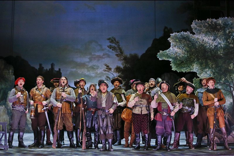 Showing the singers of old as belonging to a company of players, we see them arrive in “day wear” during the overture, and, in one of the cleverer period touches, the singers who are not in the final act are seen to have changed back to their 19th century day wear for the curtain calls.