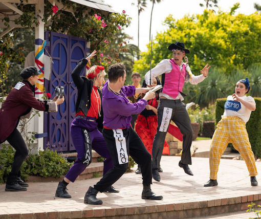 Director Ben Adams succeeds on a number of levels, not least of which is the deft editing of the five act play to a breathlessly brisk 82-minute running time. Physical comedy is at a premium, paying dividends whenever characters have to reenact violent moments that have already transpired. Best of all, Adams has the talented troupe of 14 players working in a distinctively uniform style, allowing the comedy to flourish with nary a weak link.