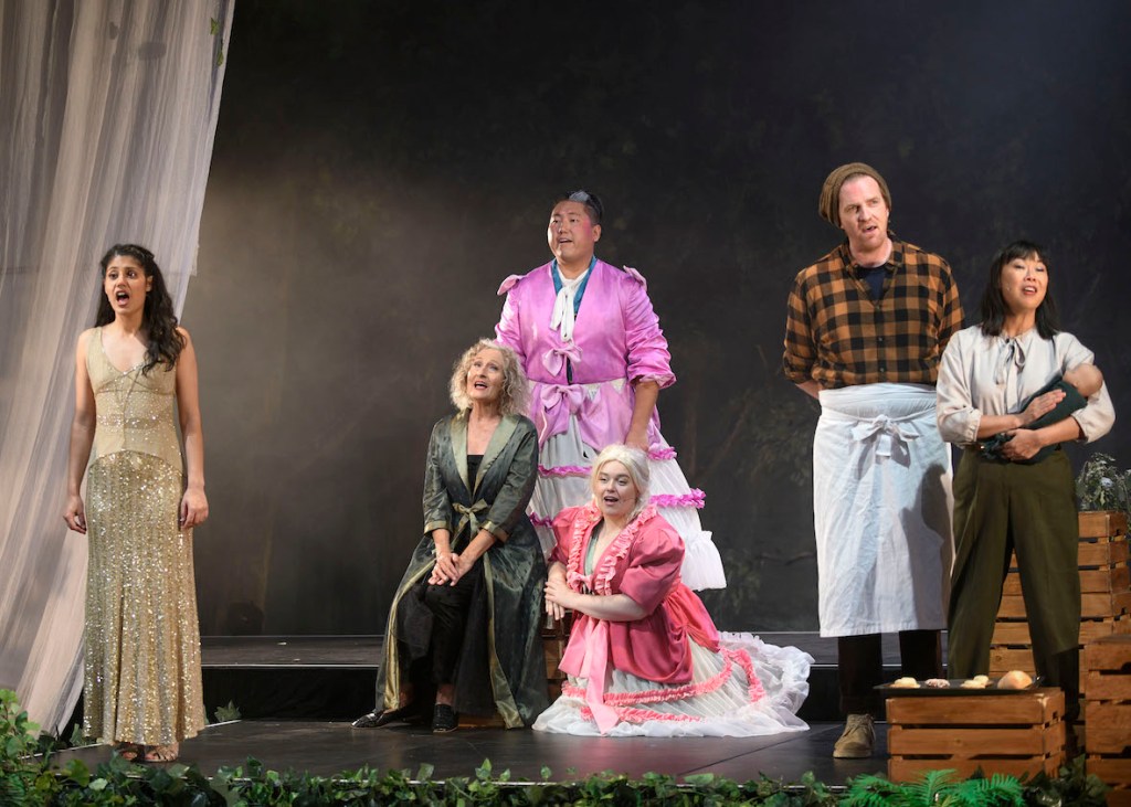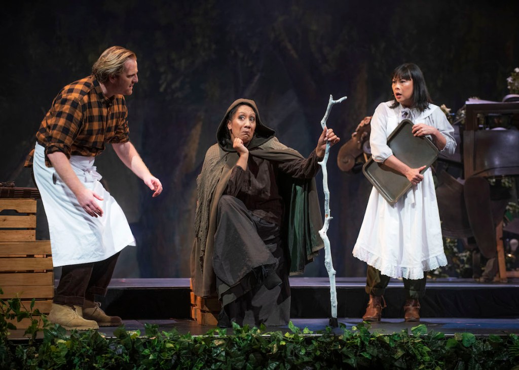 Nick Simpson-Deeks and Raphael Wong score every possible laugh as the vainglorious Princes. As the Wolf, Simpson-Deeks’ gorgeous voice and stylishly sinuous movement successfully distract from the devilish lyrics of “Hello Little Girl.” Successfully crossing over from the world of opera, Wong also hilariously doubles as haughty stepsister Lucinda.