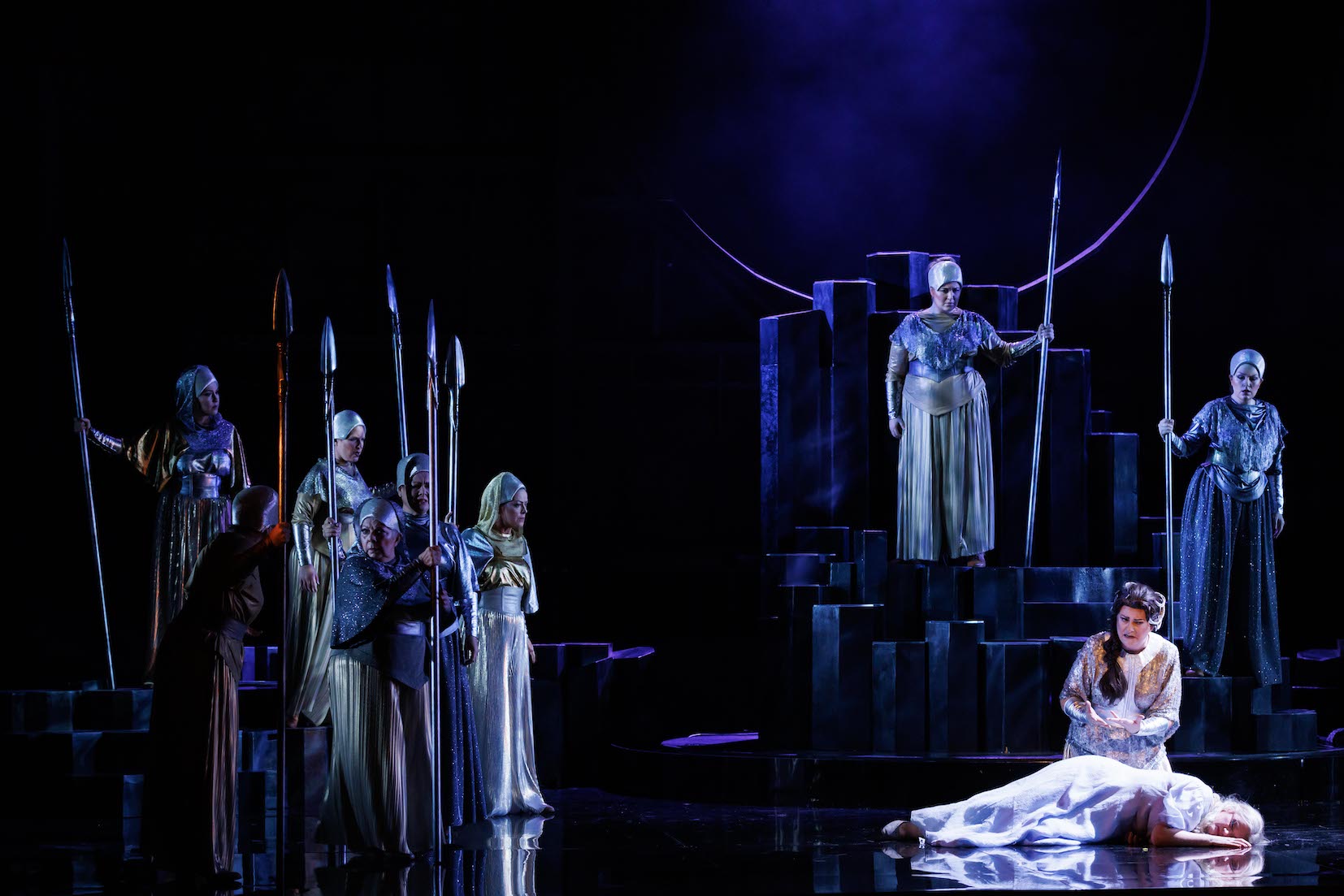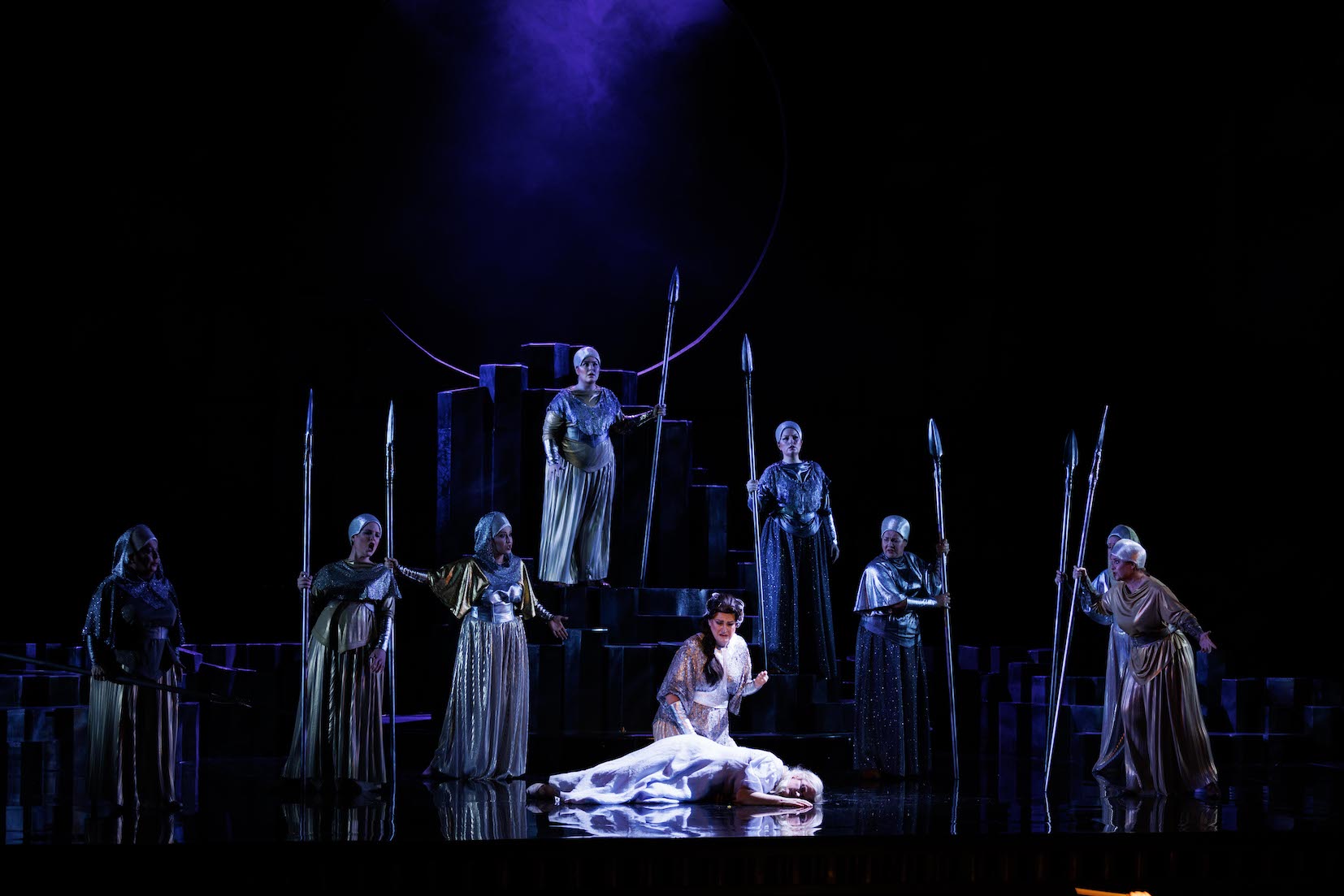 Of the nine excellent singers playing Valkyries, living legend Rosamund Illing, as Gerhilde, is first on stage, earning a warm round of entrance applause from the opening night audience. Harmonies are at a premium as the Valkyries build in number, each performer a leading lady in their own right. In the only ensemble scene of the night, Chaundy makes the most of the chance to dress the stage with dynamic divas.