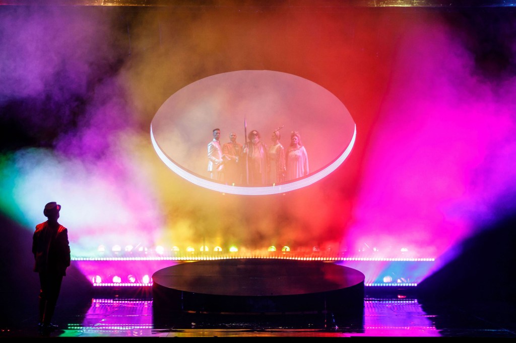 Andrew Bailey’s set design is a masterful feat of engineering, matched with extremely clever integration of the ring motif. A round platform sits centre stage, neatly met by the round hole in the mighty drawbridge that rises and lowers to conjure the mountaintop and the subterranean. A third circle is carved out of the backdrop, giving a sense of sweeping grandeur.