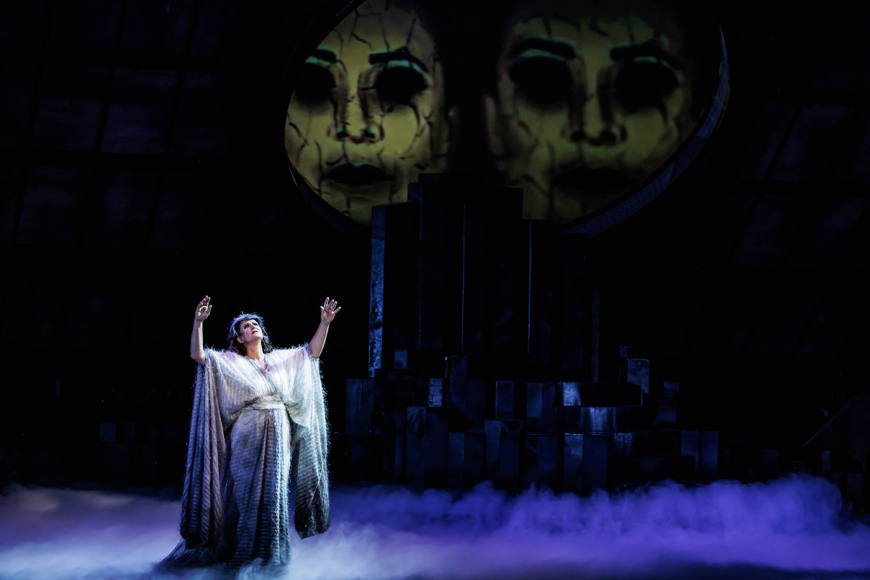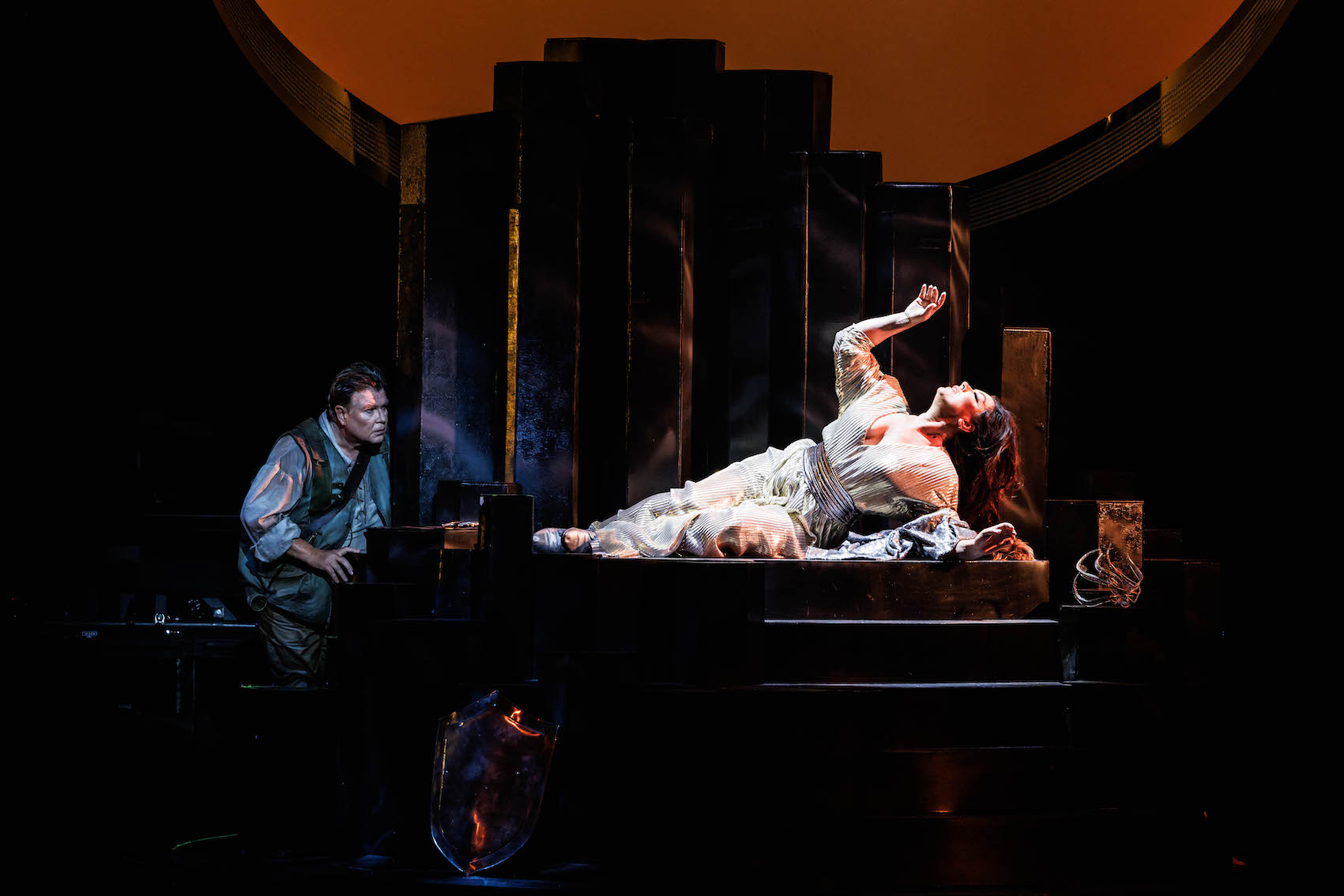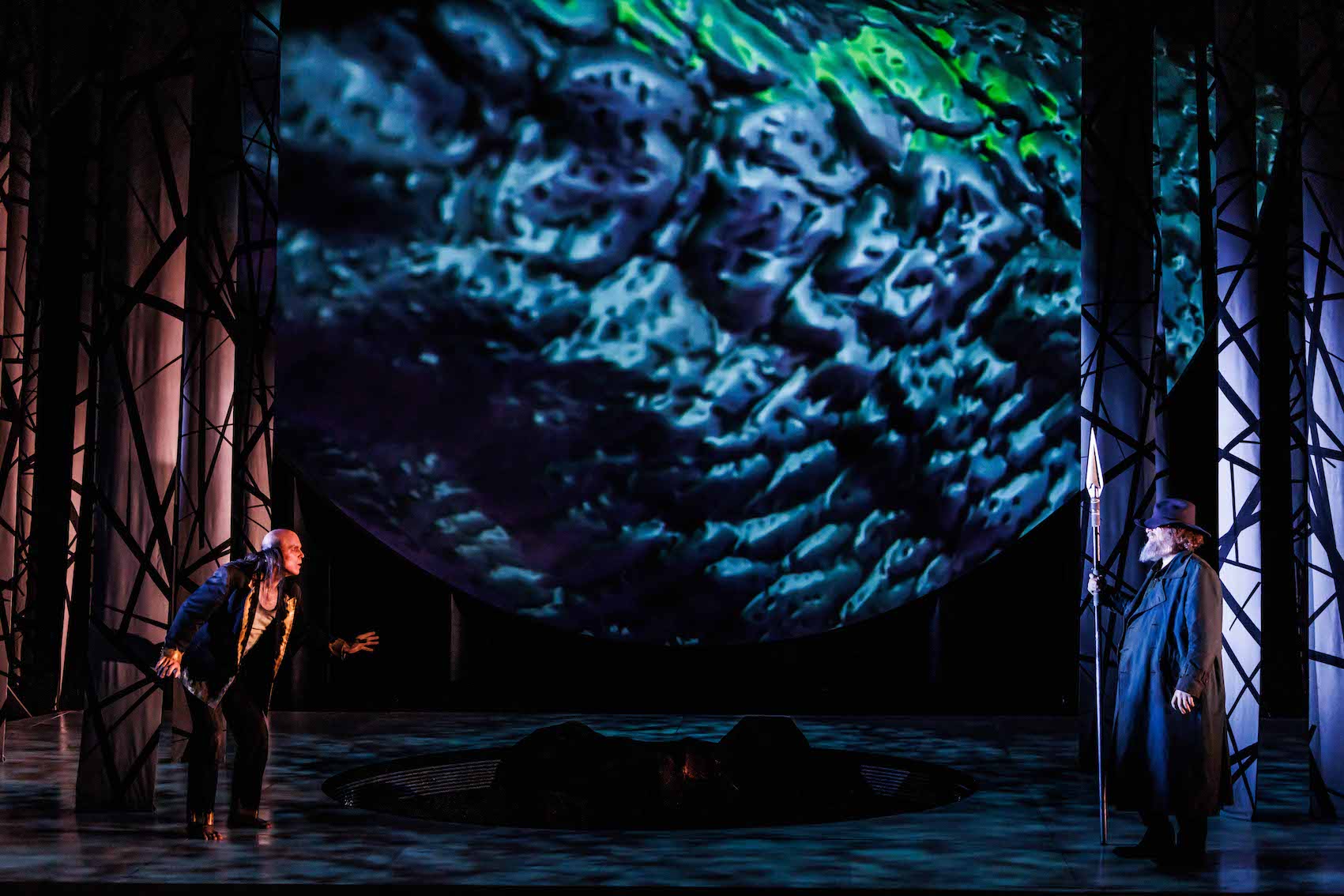 Act three moves between the underground, where The Wanderer summons earth goddess Erda, and the rocky circle of fire where Brünnhilde awaits her heroic rescue. Filled by a beaming sun when Brünnhilde awakens, the backdrop transitions to a golden sunset as Brünnhilde ultimately succumbs to the love of a mortal man.